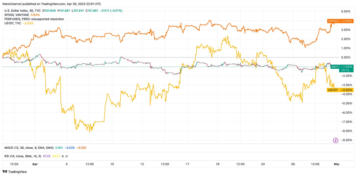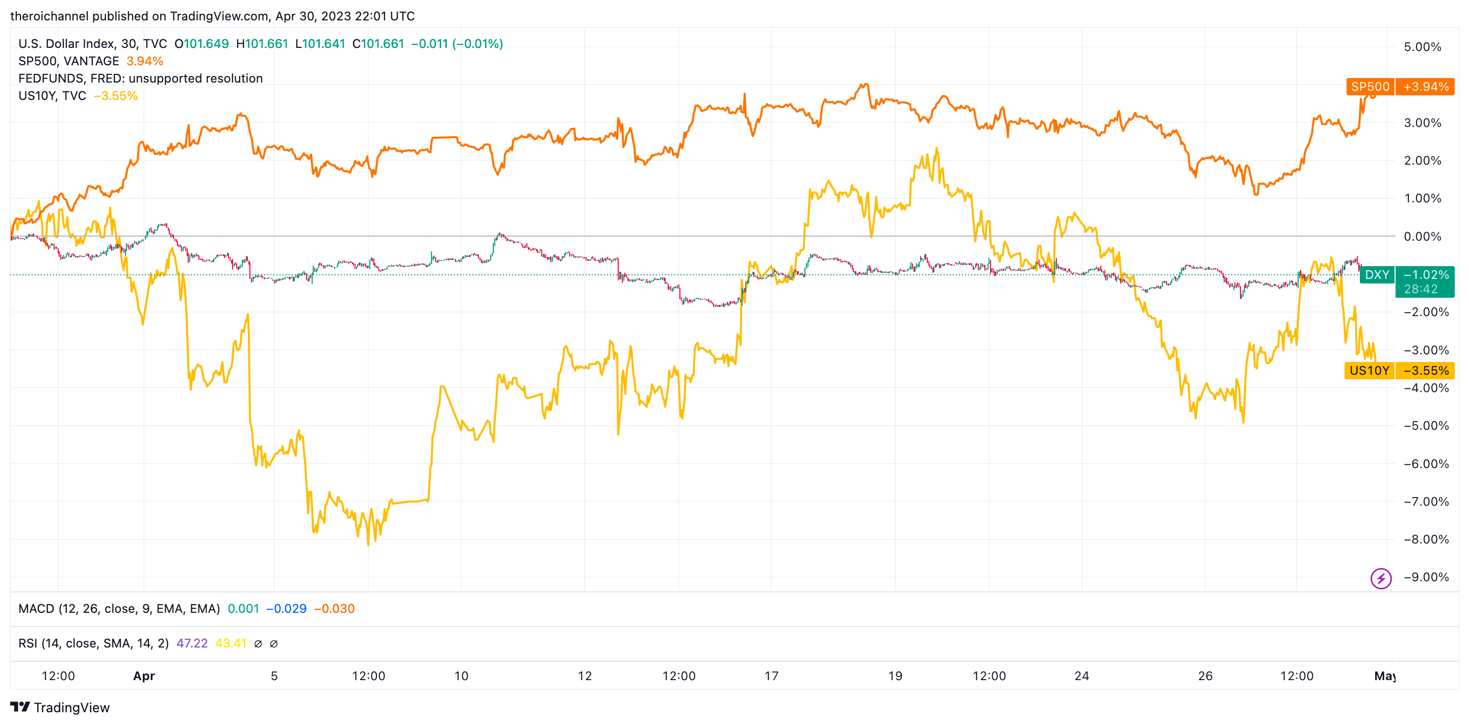 Key takeaways for me: US 10 yr treasury yield is down MTD 3.55% which has helped the SP500 rise 3.93% as shown on the chart below.