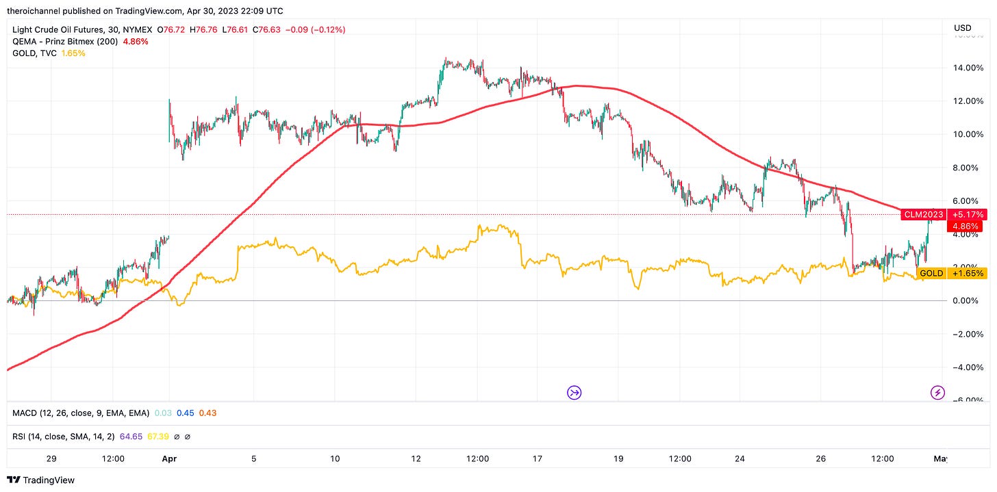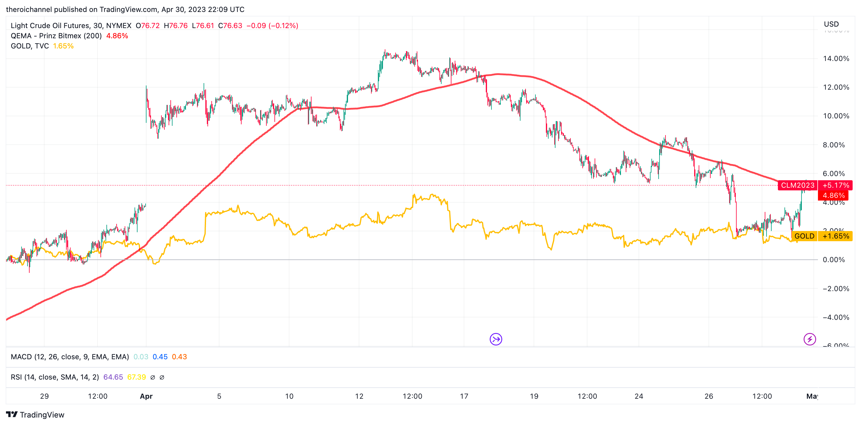 Gold also anticipates a softening of monetary policy on the horizon in the USA, up 1.65% in April and 8.78% YTD while oil was up 5.17% in April it remains down YTD (-5.44%) and below its 200MA.