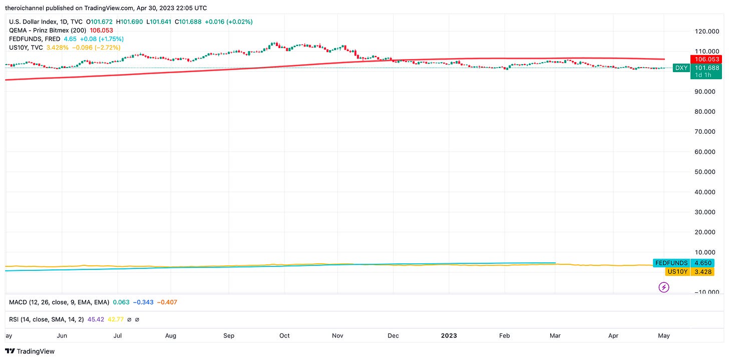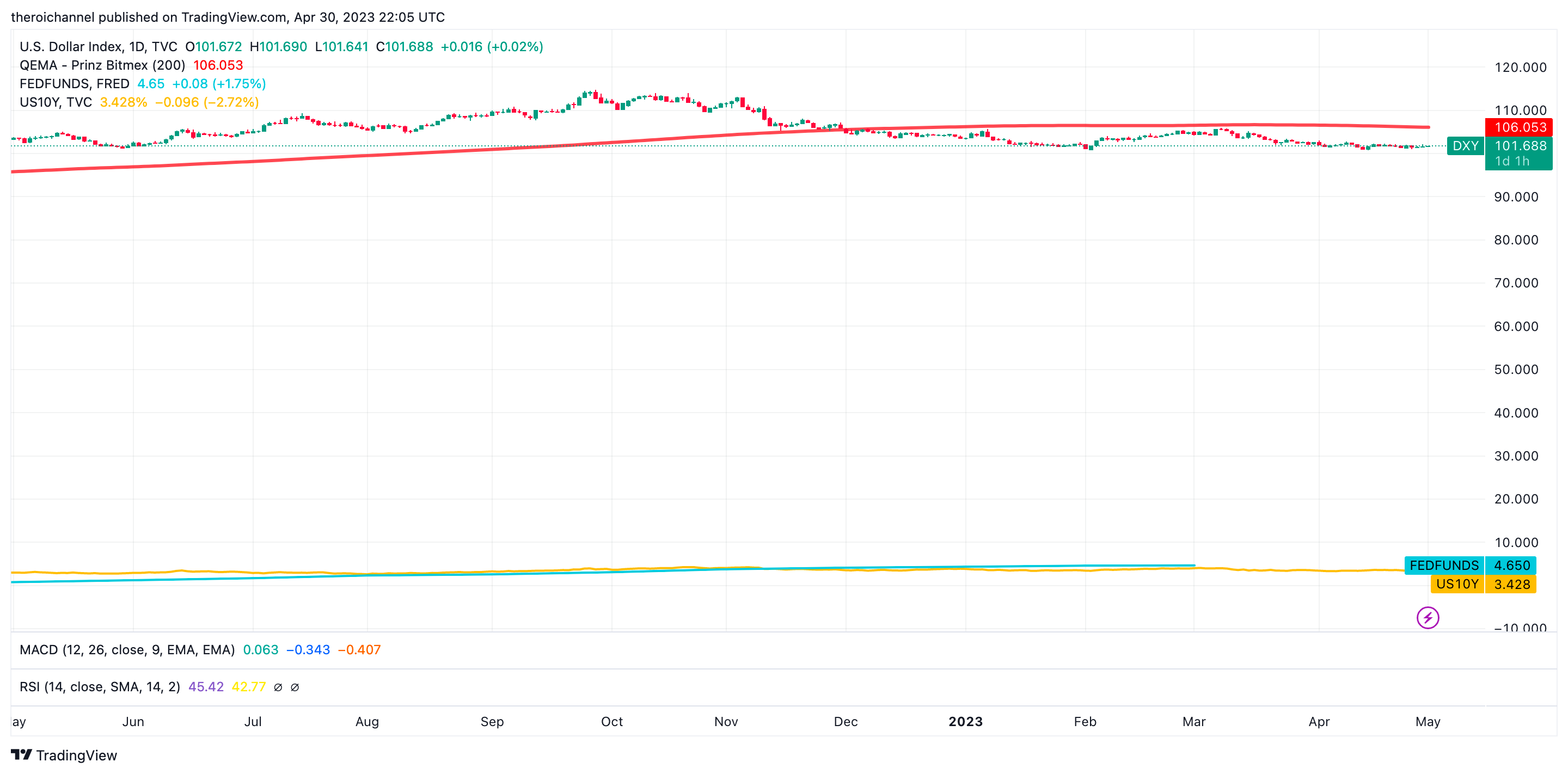 Taking a look at credit conditions we can see the yield curve remains inverted with short term Fed Funds Rate (FFR) remaining higher than longer duration treasuries such as the 10 yr note. This means the bond market is still pricing in a recession and anticipates the FED will have to pause/reverse its rate hiking cycle. If/when that happens I’d expect to see the dollar index (DXY) roll over and weaken as short term US instruments will become less attractive and foreign inflation-resistant stocks (which I own and have shared with group members) should see their values realised.
