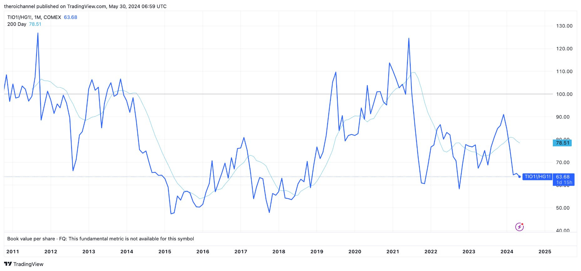 The main demand use for Iron Ore is steel production: for infrastructure, construction and manufacturing sectors, similar in fact to copper, yet Fe2O3 (iron ore) has rarely been cheaper relative to copper in recent history (see below).