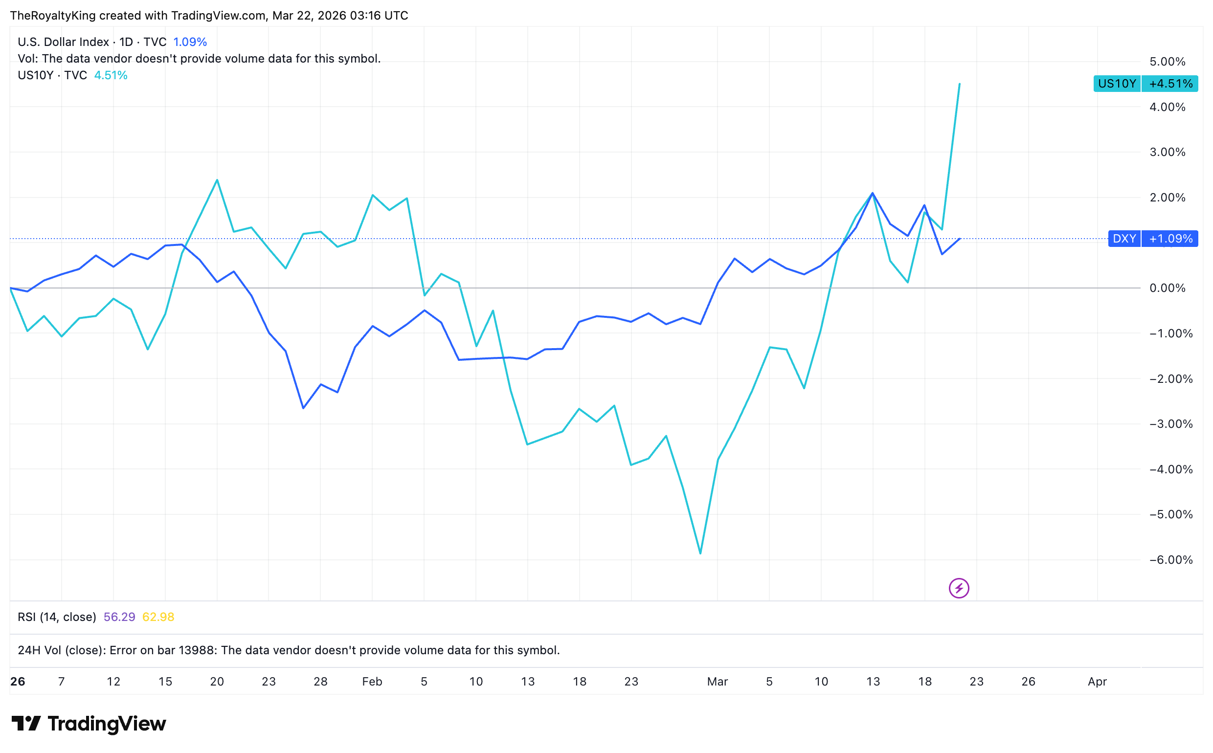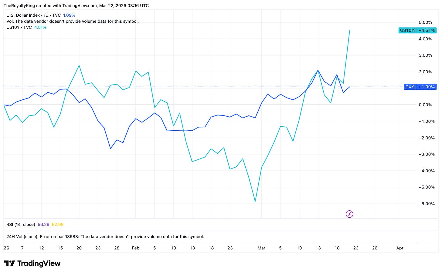 Capital flowed across to dollar denominated instruments and now the US 10yr yield is up 4.5% and the DXY; a measure of the dollar’s relative strength is also on the rise.
