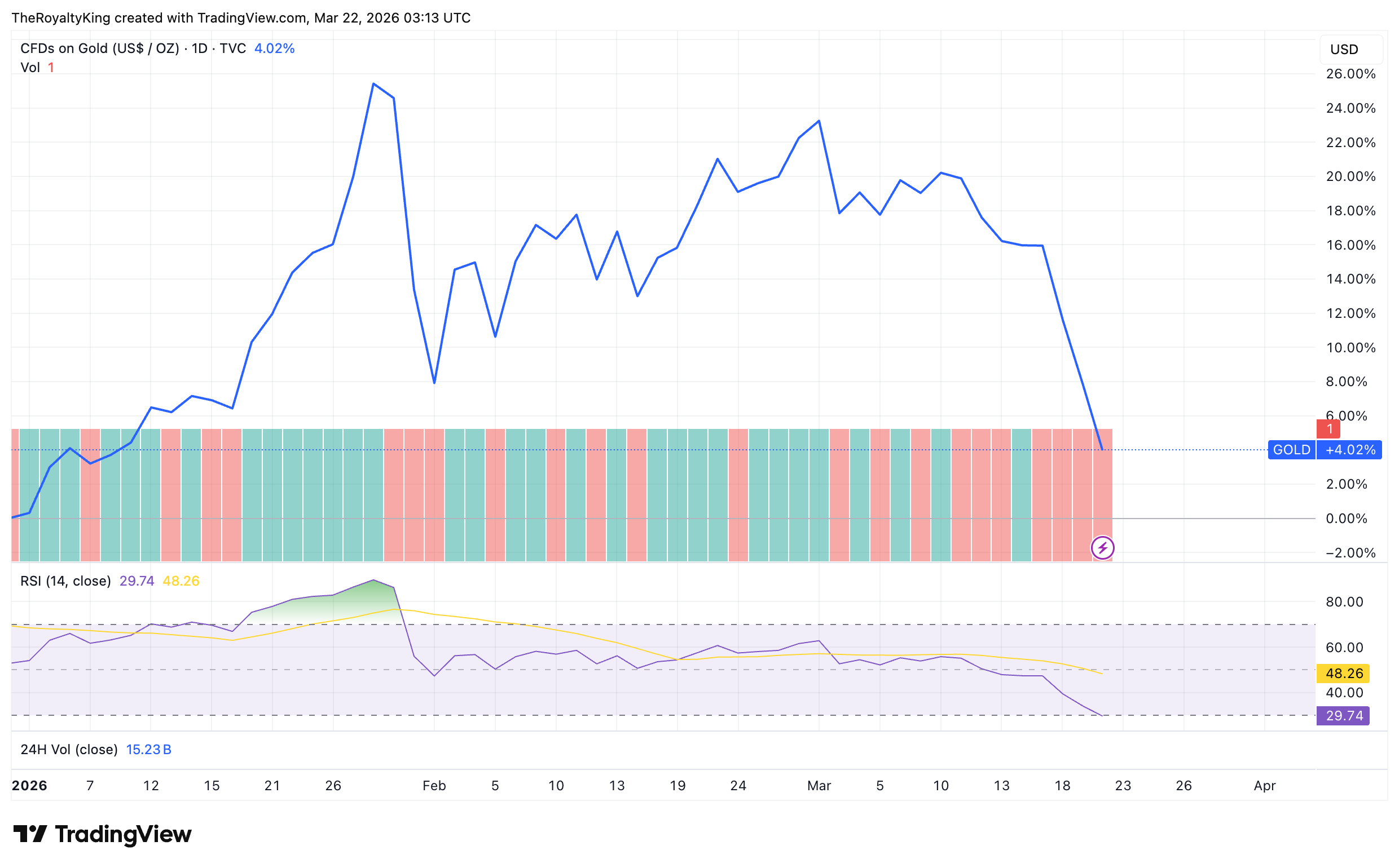 Gold’s price declined sharply this week (11%), the worst weekly sell off in years. To paraphrase a Bessent-quote, this occurred due to there being more sellers than buyers, with over $1billion in combined outflows in a single day, March 19, from the major ETFS: GLD and IAU.