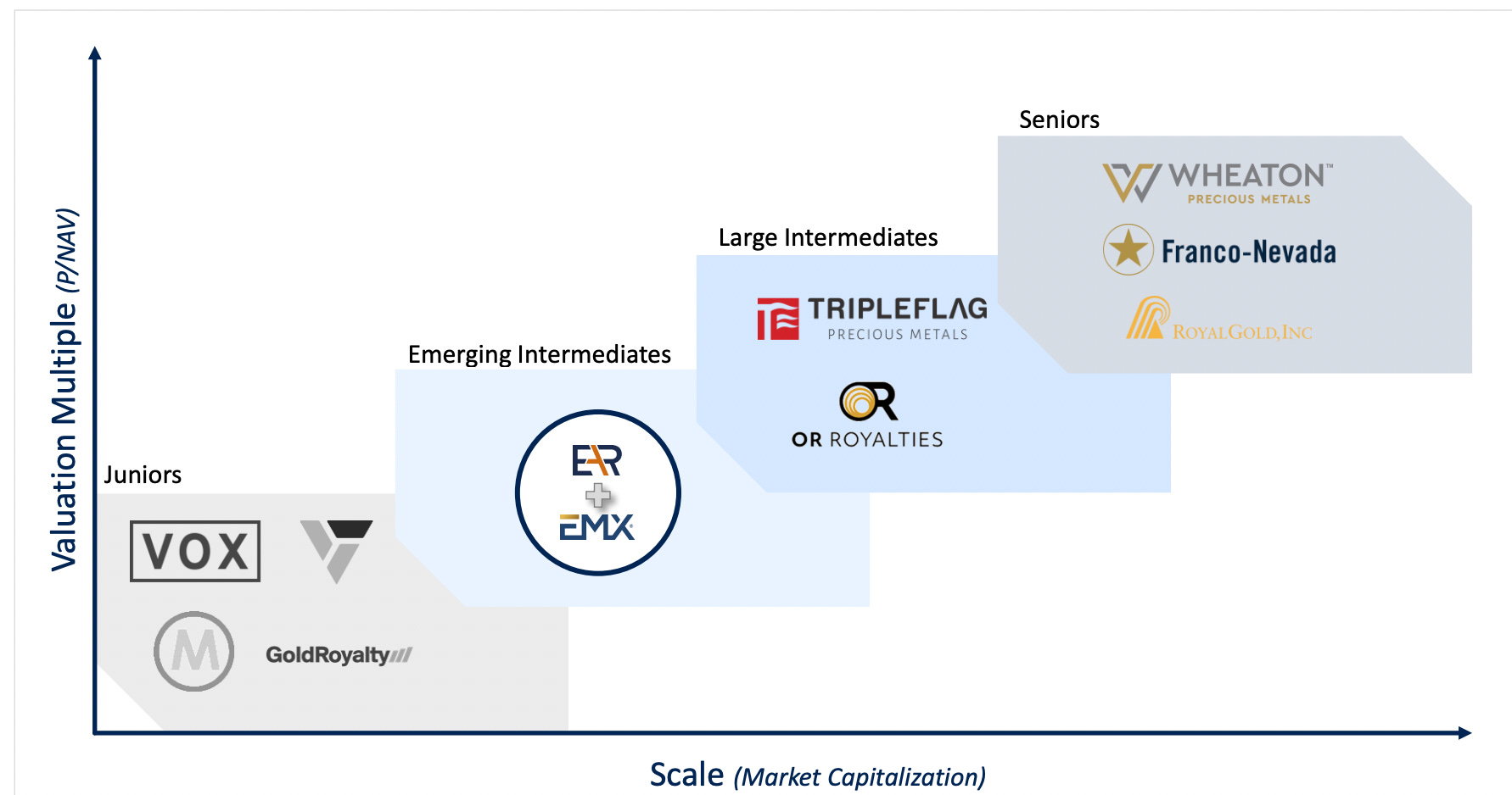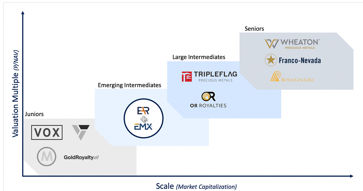 The below chart illustrates just how bifurcated the royalty space was in terms of the multiples paid for the larger caps Vs smaller caps.