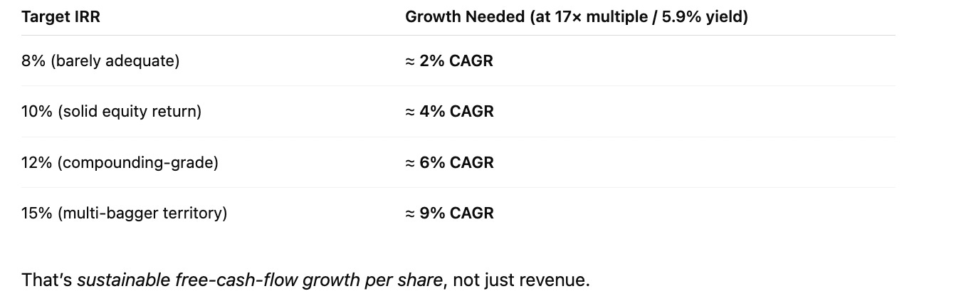 Paying 17× EV/FCF gives you a 5.9% starting yield. To earn an attractive equity-style return, you need at least ~6–9% annual FCF/share growth, or a rerating catalyst.