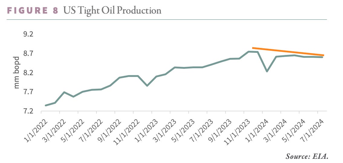 IEA reproduced in GR’s quarterly commentary and edited by myself. The orange line indicates a reduction of 150,000 BBls/Day since the start of the year. YOY growth of ~200K BBls/day is the lowest since 2016 (bar COVID).
