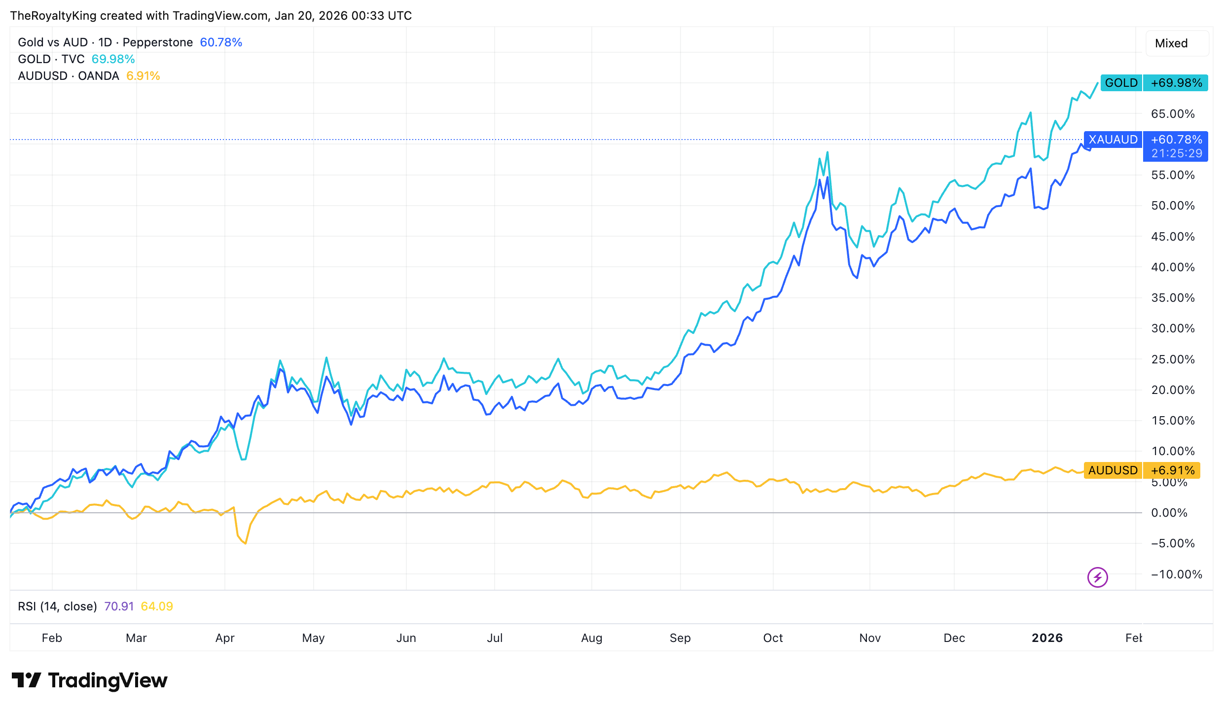 Net capital flows into Australian financial assets have turned positive year-over-year, while higher gold prices lifted export earnings to roughly A$47 bn in 2024–25, despite physical production rising only modestly from ~290 T to ~300 T. An investor or entrepreneur with a source of income denominated in AUD currently can buy USD denominated assets at a 7% discount.