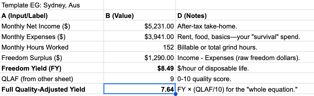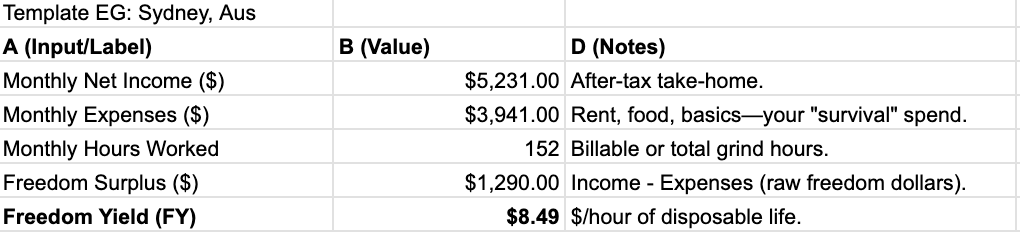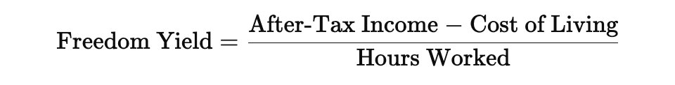 A New Yorker earning $10,000 a month after tax, spending $7,000 to survive, and working 240 hours has a Freedom Yield of $12.50/hour.