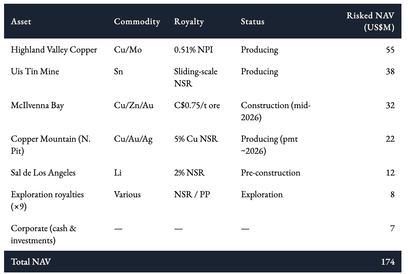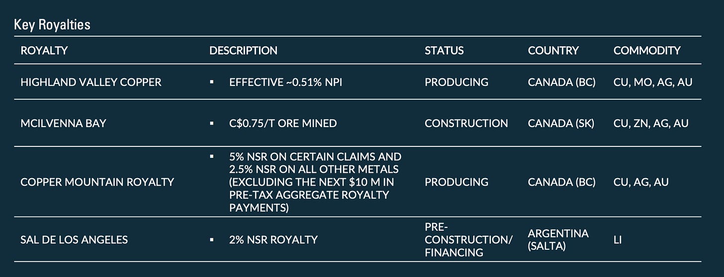The cornerstone asset is a 0.51% Net Profit Interest (NPI - A weaker type of royalty) on Highland Valley Copper in British Columbia and is Canada’s largest open pit copper mine, operated by Teck Resources since 1962. In 2025 HVC produced 127,100 tonnes of copper. In July of that year, Teck sanctioned a Mine Life Extension program that extends the mine’s operating life from 2028 through to 2046, at an average annual copper production of 132,000 tonnes.