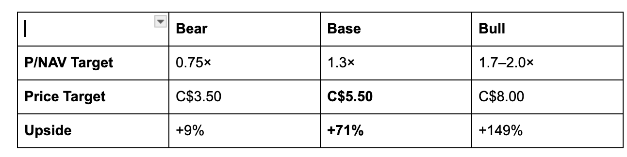 The NPI structure concentrates approximately 32% of our NAV estimate in a single asset which is a concentration that warrants disclosure. An NPI is more leveraged to copper prices than an NSR: it only pays when the mine is profitable above Teck’s reported cost base and Teck controls those inputs. In a sustained low-copper-price environment this structure may underperform a simple royalty.