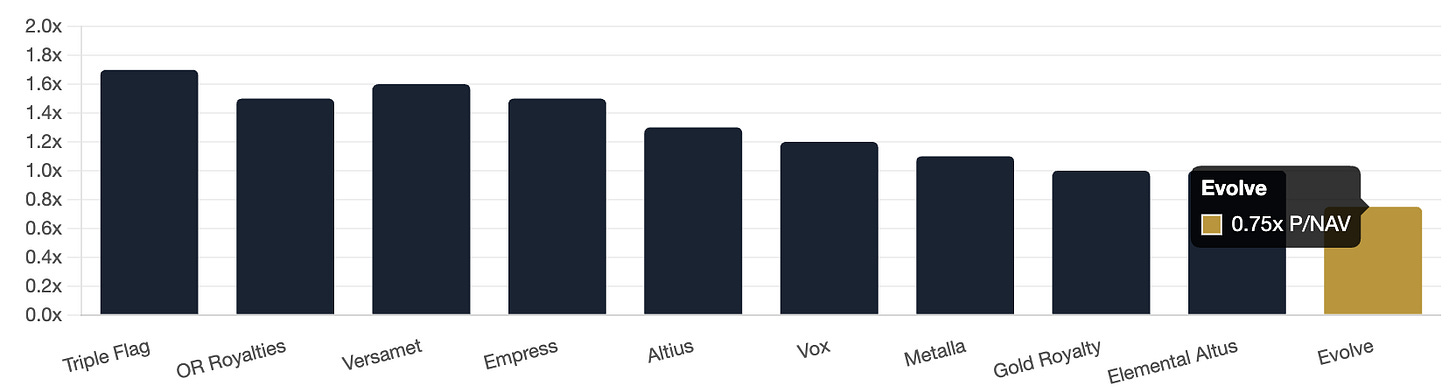 Gold Royalty and Elemental Altus trade at or above 1.0×. Triple Flag and Versamet sit at 1.5–1.7×. Thus the NAV discount applied to Evolve is not subtle.