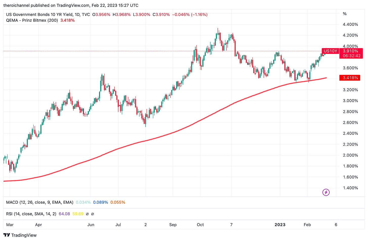 The two assets I’m most interested in currently are the US10yr yield (seen below) and the front month crude oil futures (below that).
