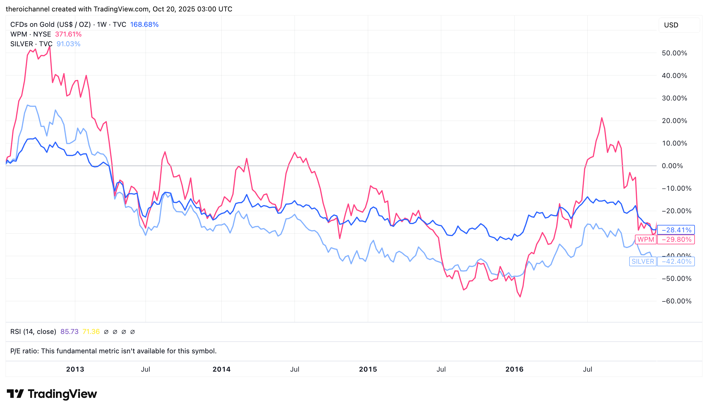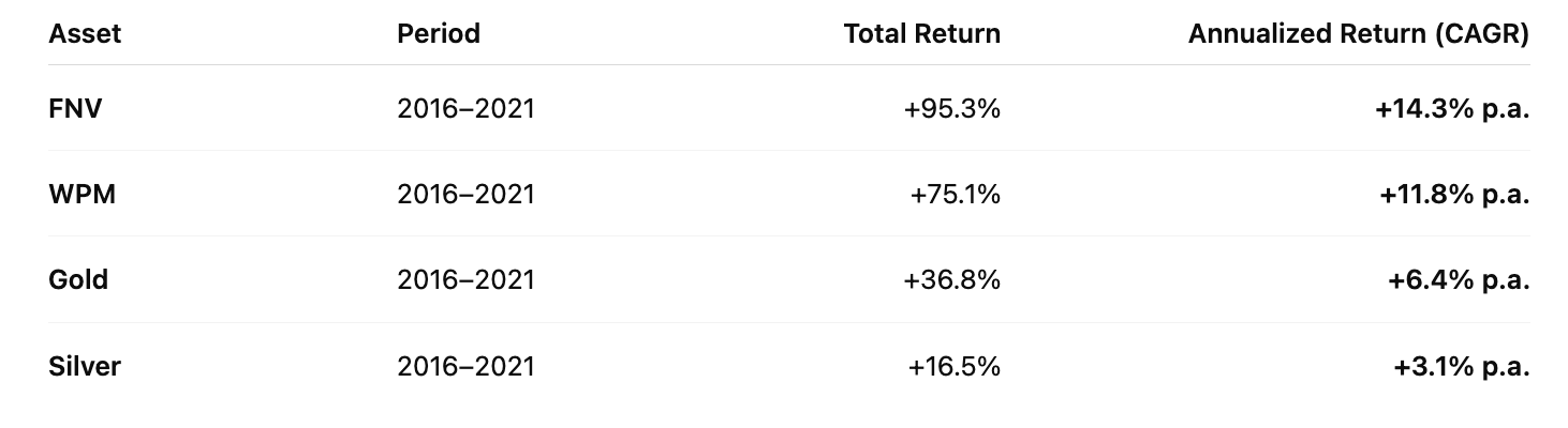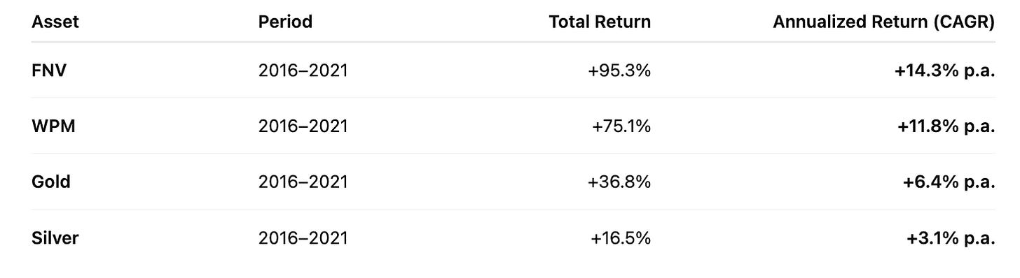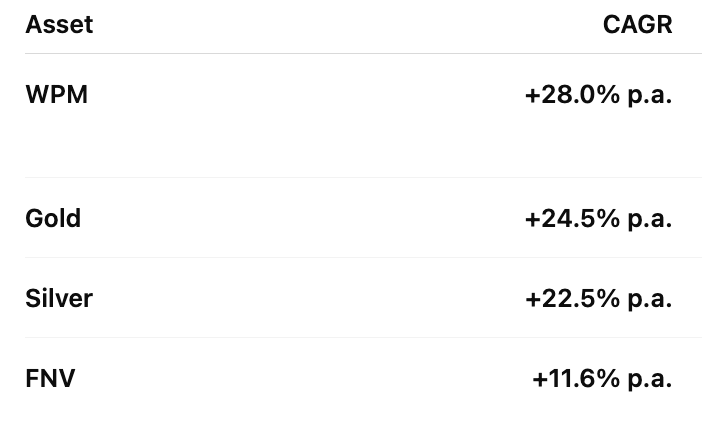 After pivoting towards a more even focus across precious metals, WPM soon caught up over the next 5 years, a period in which again showed anaemic price growth in both gold and silver.