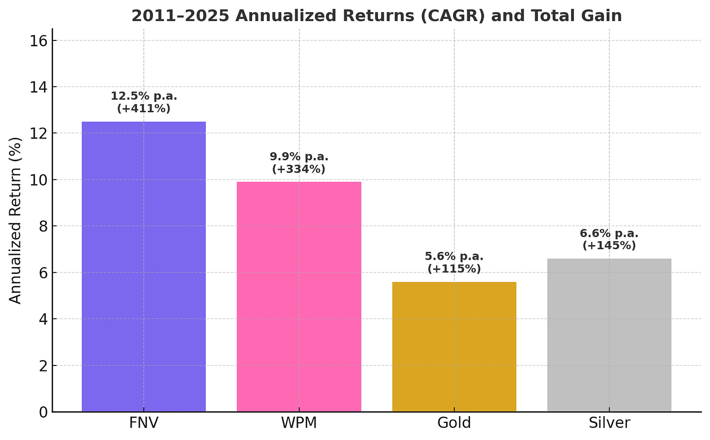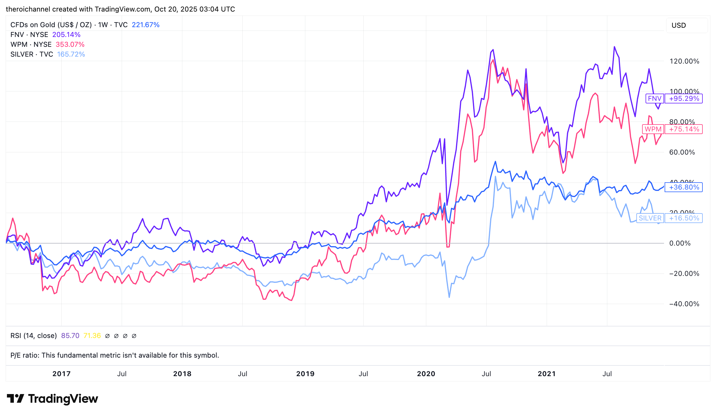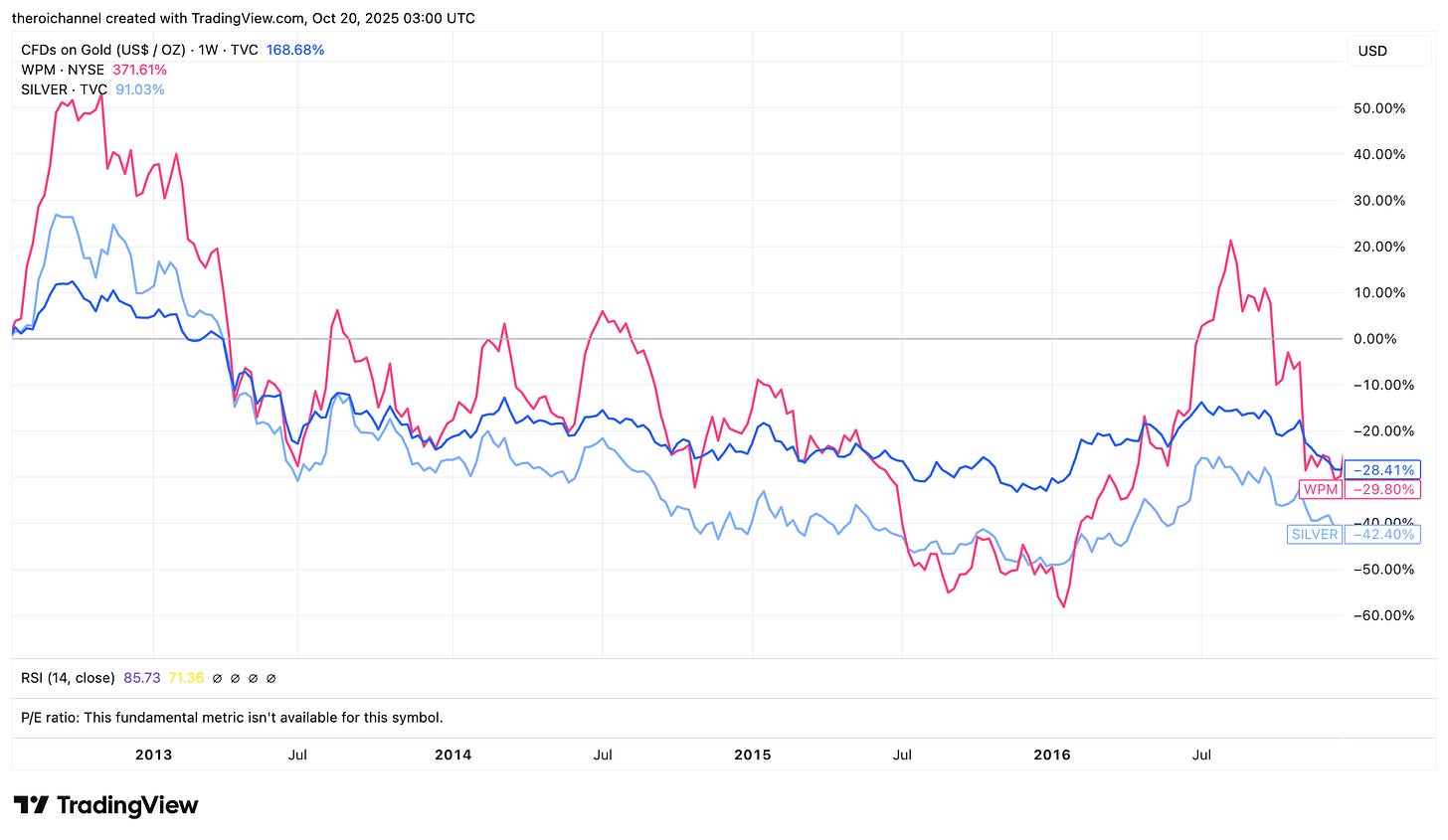 After pivoting towards a more even focus across precious metals, WPM soon caught up over the next 5 years, a period in which again showed anaemic price growth in both gold and silver.