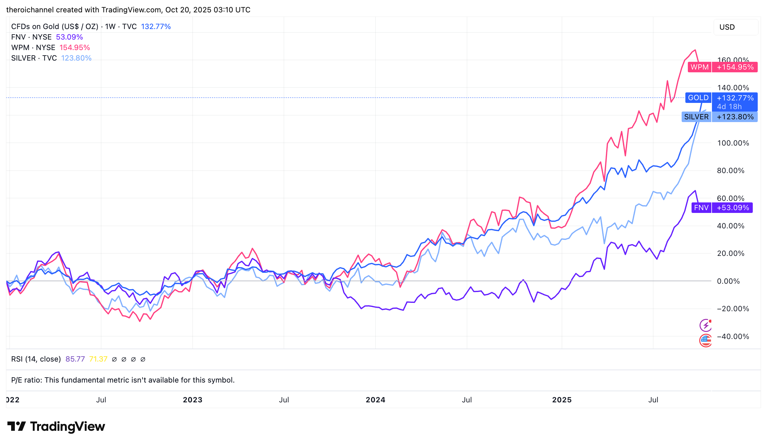 Silver has caught up thanks to its recent rally and yet WPM outperforms both metals even before dividends.