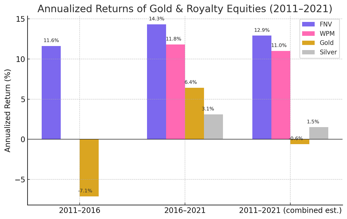 Combining multiple 5 year periods which nicely illustrate bear, base and bull cases for Gold and Silver as well as their two largest royalty operators the results look like this: