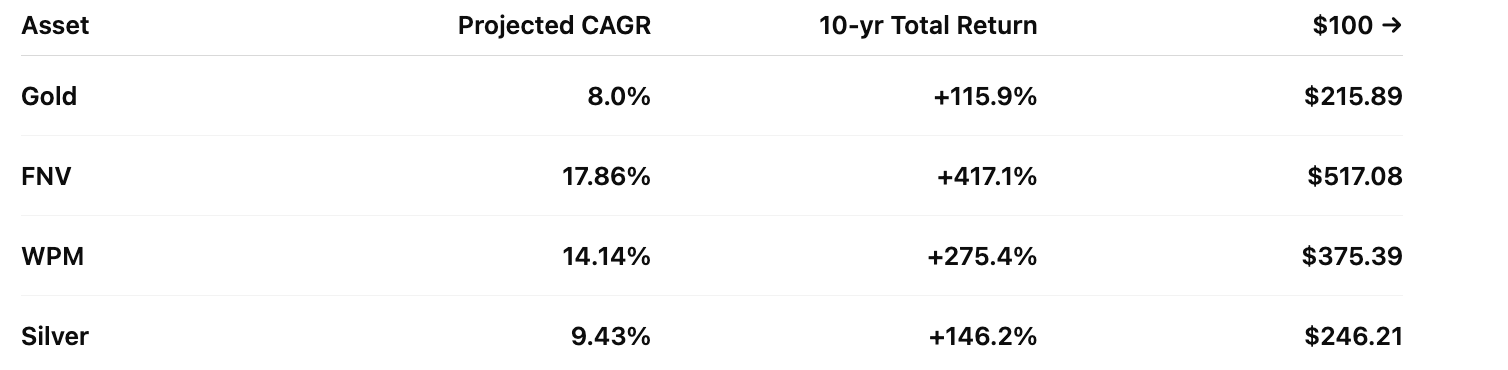 In a world of decaying fiat currencies the gold price is likely to do even better than 8% compounded and that of course would be expected to result in further outperformance of the major gold Royalty and Streamers.