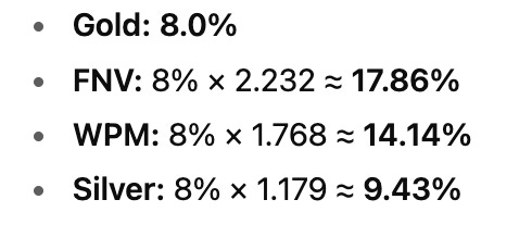 Running the math on the performances above shows that over a period where the prices in gold and silver rise at typical rates, the 2 main royalty and streamers once again outperform handsomely.