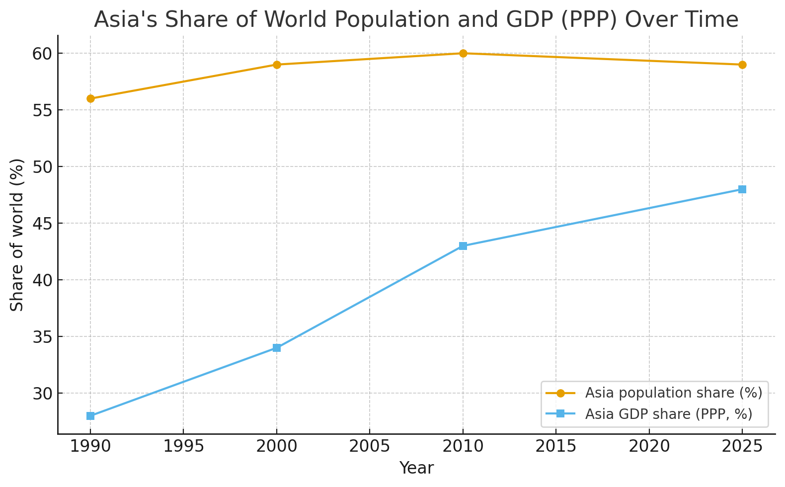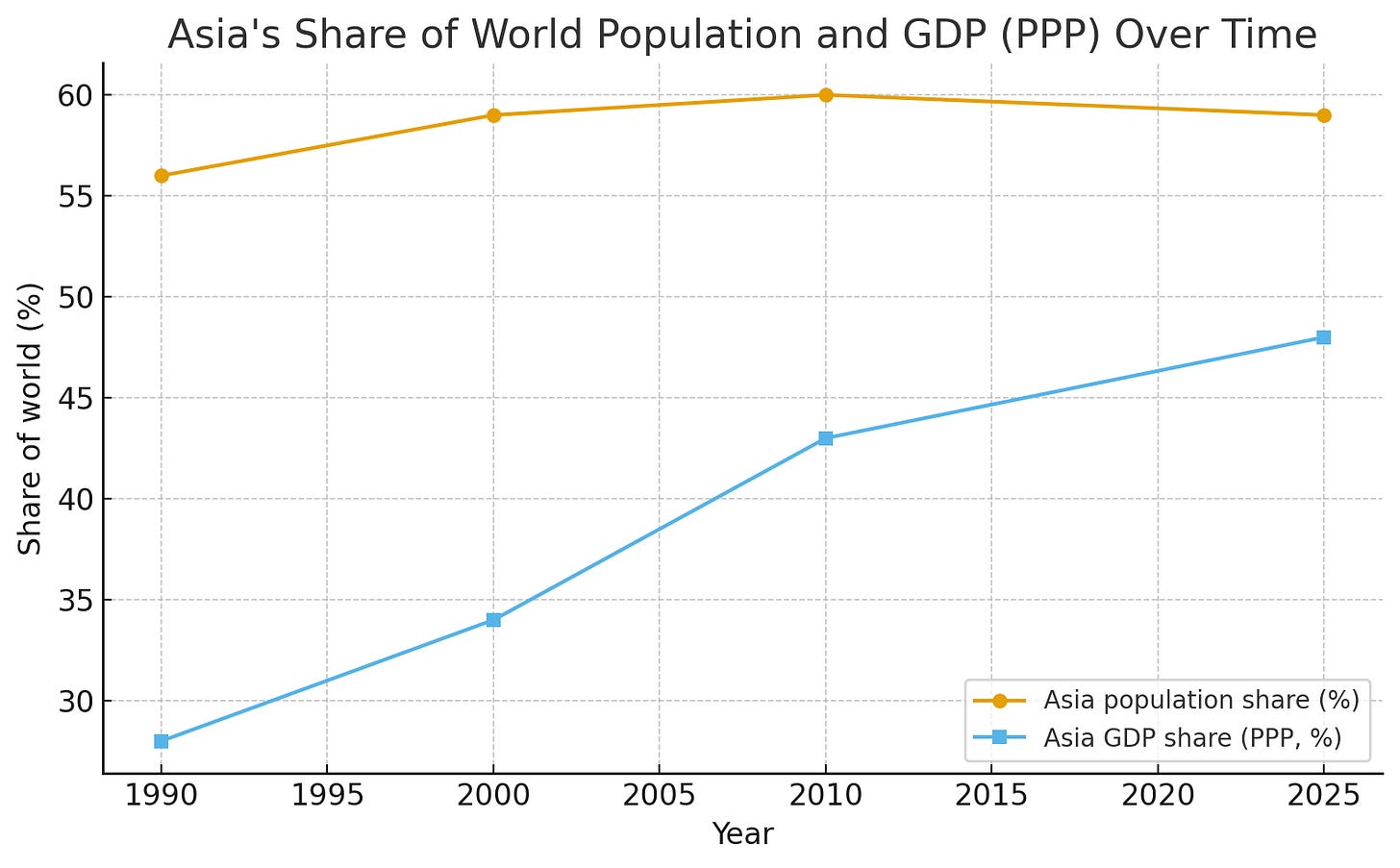 A conspicuous gap remains in the portfolios I manage: meaningful exposure to Asia. It is an omission difficult to justify when the region accounts for roughly 4.8 billion people or about 59% of the world’s population with a collective GDP of $41.5 trillion. Measured on a purchasing-power parity (PPP) basis, that figure rises to nearly $94.7 trillion, or close to half of global economic output. A region of that scale cannot be treated as peripheral; it is, in many respects, the economic centre of gravity.