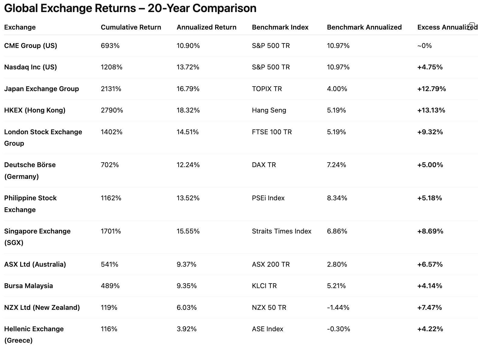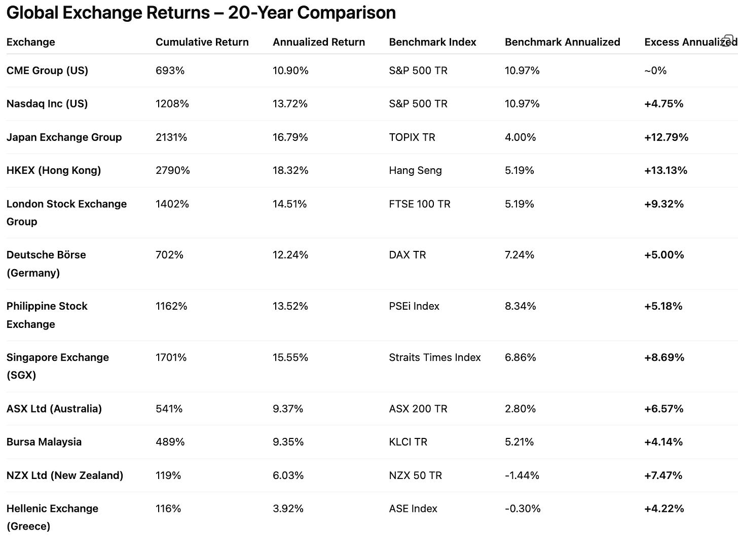Hence the conclusion: exchanges and clearing houses. They provide exposure to a region’s economy without requiring a thesis on which companies will win. Much like royalties outperform operators across a commodity cycle, exchanges often exceed the returns of the very indices built upon their listings.