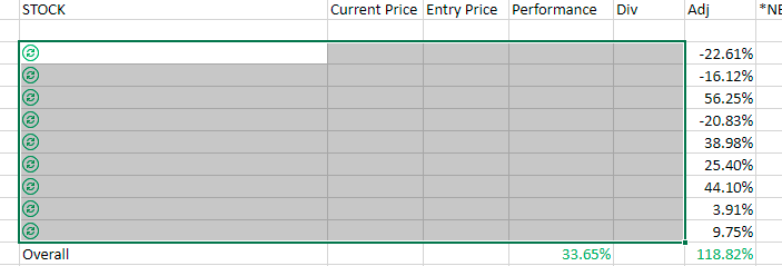 Subscribe to the ROI club today and become a member and gain access to ALL of my analyses + see a live performance breakdown of the stocks I’ve looked at in the excel sheet below ( currently up 118% Adj. at time of writing).