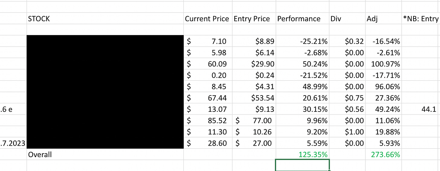 Subscribe to the ROI club today and become a member and gain access to ALL of my analyses + see a live performance breakdown of the stocks I’ve looked at in the excel sheet below ( currently up 273.66 % Adj. at time of writing).