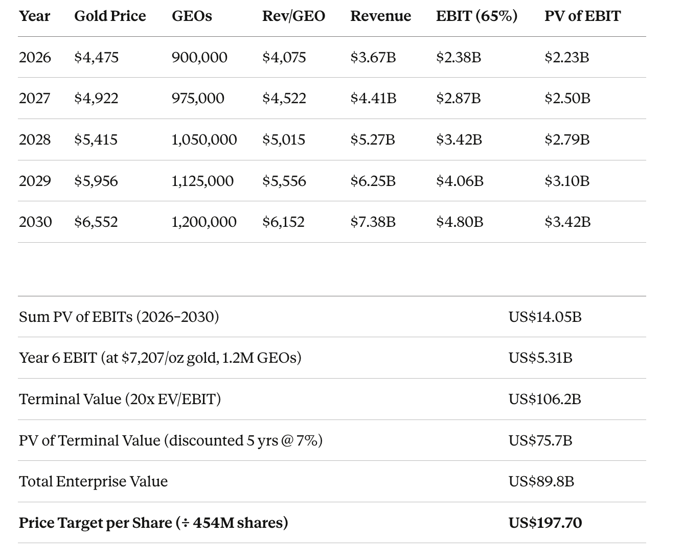 In a US$6,000/oz gold environment by 2029, WPM offers compelling re-rating potential as the market is forced to mark up intrinsic value. The combination of production growth to 1.2M GEOs, sector-leading margins, and no operational risk makes this a core holding for my expressing a long-term bullish view on gold.