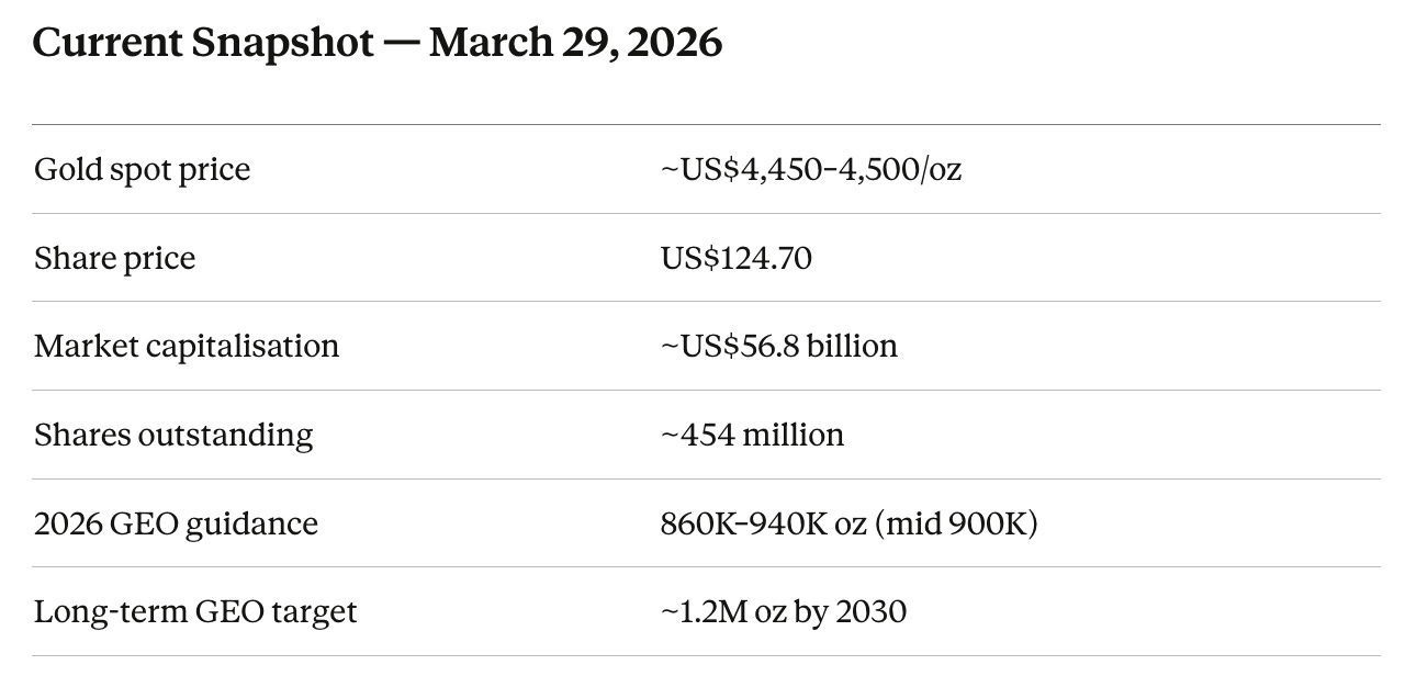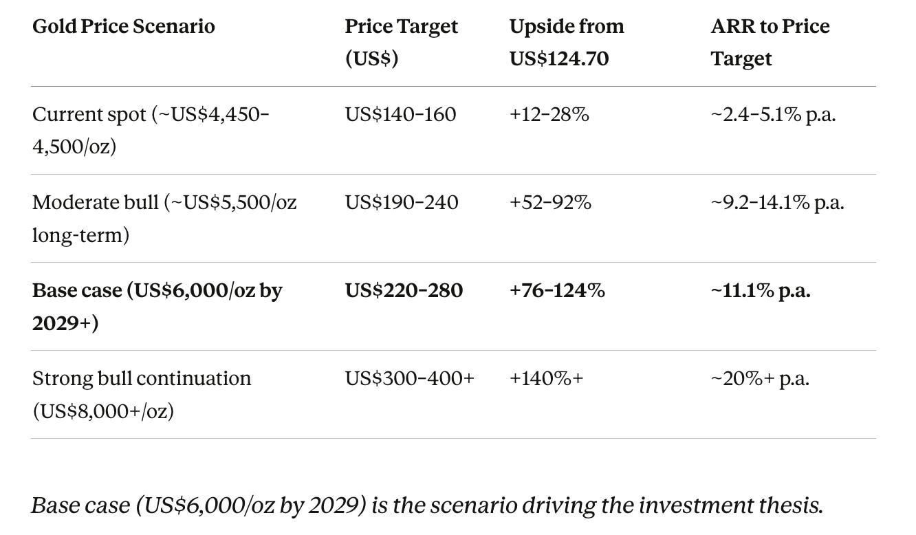 At the current gold spot price of approximately US$4,450–4,500/oz, my estimated price target is US$140–160. In my base case with gold reaching US$6,000/oz by 2029 and sustaining elevated levels thereafter, the 5-year DCF produces a price target of US$197.70, implying 58.5% upside and an ARR of 11.1% per annum from the current share price of US$124.70.