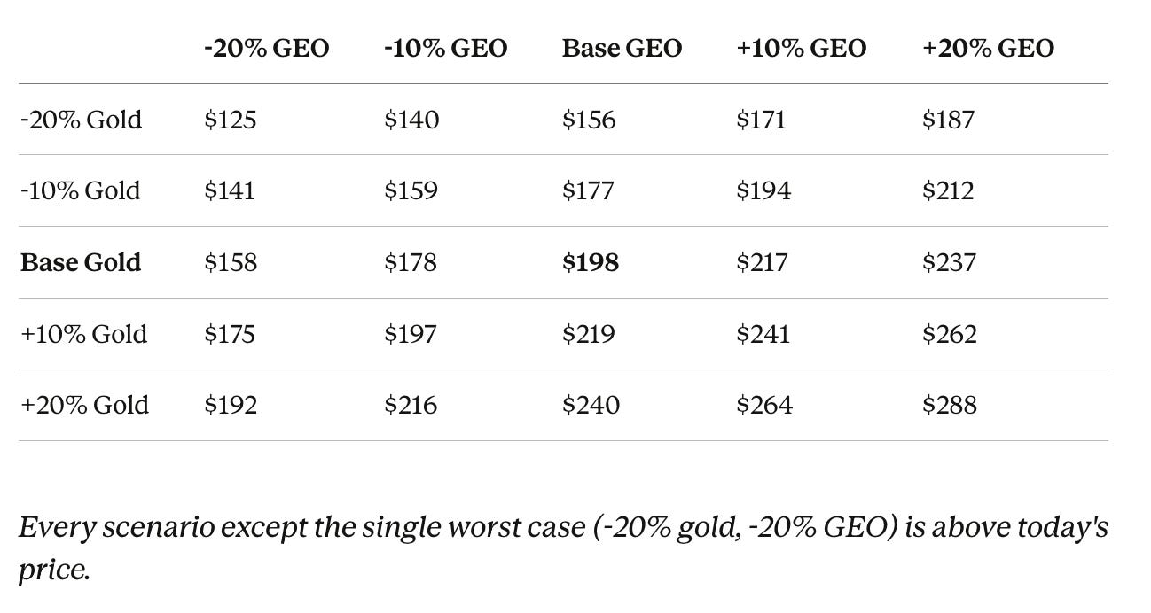 Price target (US$/share) across a range of gold price and GEO production outcomes. Base case sits at centre.