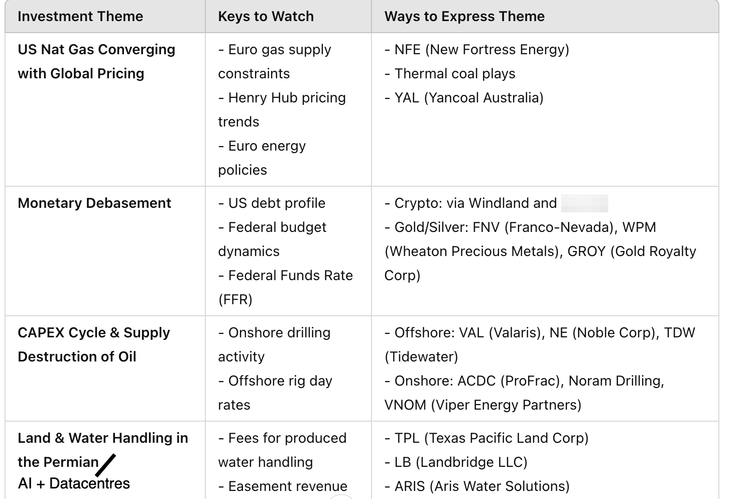 To start 2025 with clarity, I’ve put together a brief table below of my top macro investment themes, key indicators to watch and my main investments chosen to express the theme.